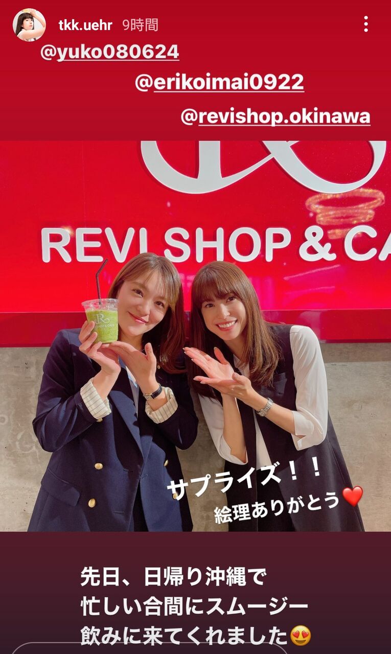 「サプライズ!!絵理ありがとう」「先日 日帰り沖縄で忙しい合間にスムージーの飲みに来てくれました」と感謝した。